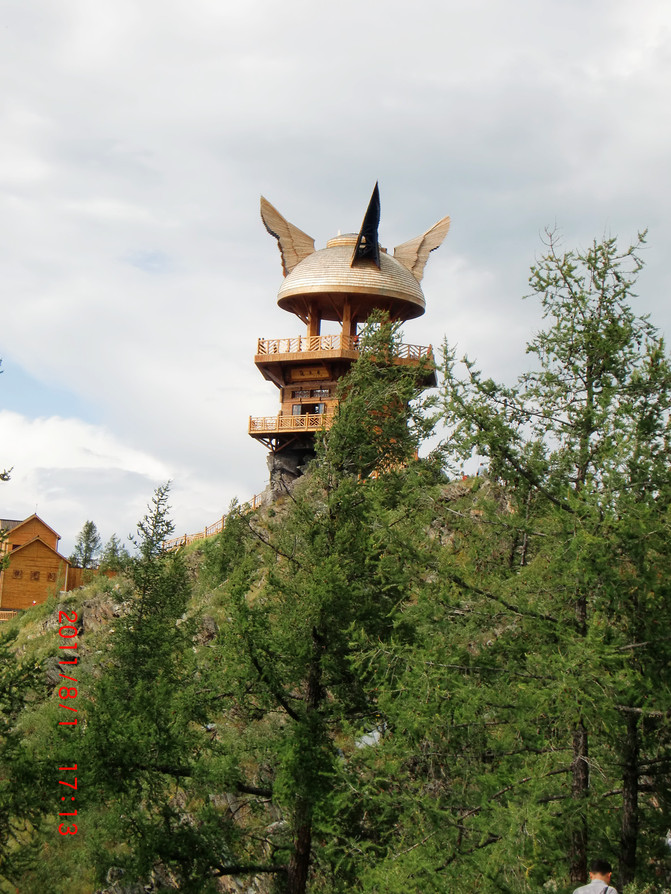 位于喀纳斯湖西岸的骆驼峰上,始建于1987年,因为这里是观察喀纳斯湖水怪的好地方,故得名“观鱼台”。观鱼台结构为两台一亭,顶部是半圆球状,有四个对称的类似于翅膀的奇异造型,是湖怪尾巴和雄鹰翅膀的寓意。
