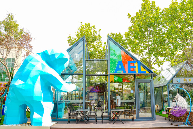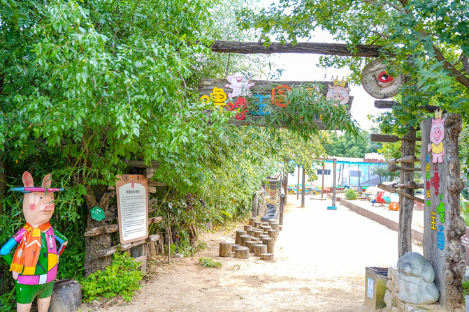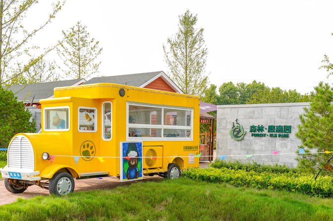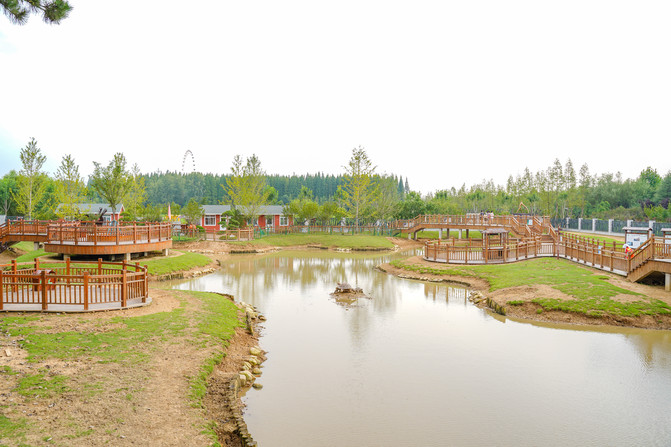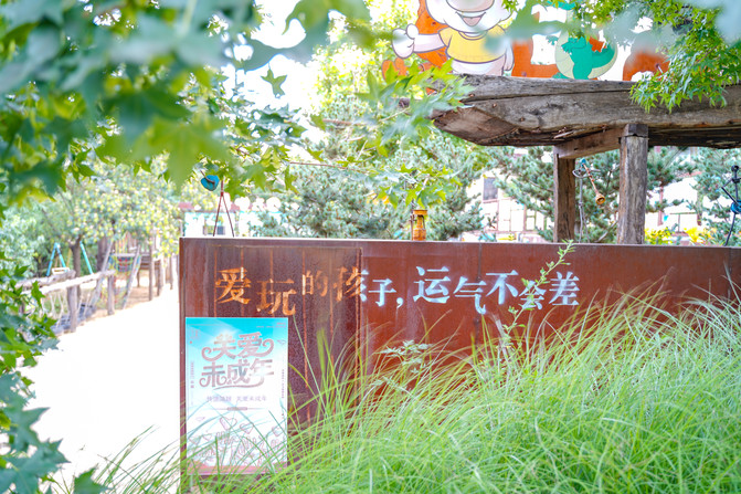 沿着草地走走停停,发现了许多意想不到的惊喜。翠林之中,几只俏皮可爱的雕像格外引人注目,定睛一看,原来这里还藏着一座儿童乐园,色彩鲜艳的招牌被绿植半掩着,高矮不一的木墩跳跃着我的视线,各种娱乐设施一应俱全,十分适合家庭出游。
