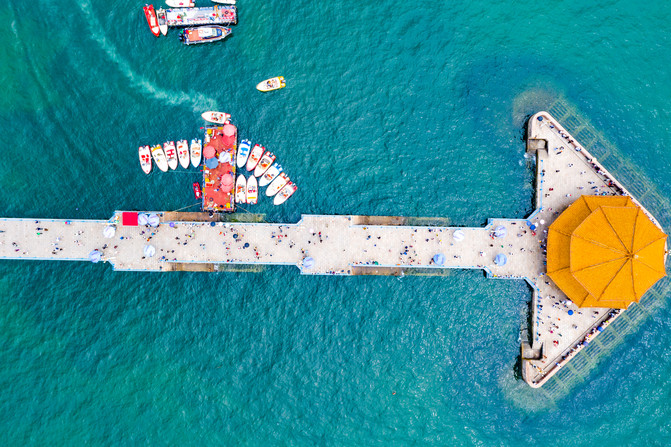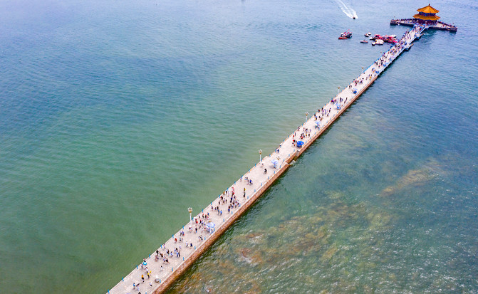 当无人机拍下栈桥的俯视图时,我更被这份深邃的气质美所打动,海面像是一块碧绿的翡翠,清冷而动人,此刻的栈桥像是一条银白色的裂纹,将这份得天独厚的碧绿一分为二,四周游轮极速滑行,以动衬静,营造出一幅云淡风轻的碧海蓝天。