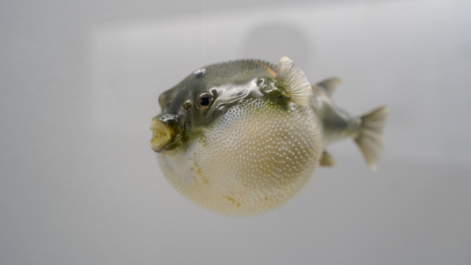 走进河豚主题馆,棕白相间的装修尽显雅致,玻璃柜内陈列着一件件河豚艺术品,造型千奇百怪,将河豚本身的古灵精怪诠释得毫无保留。