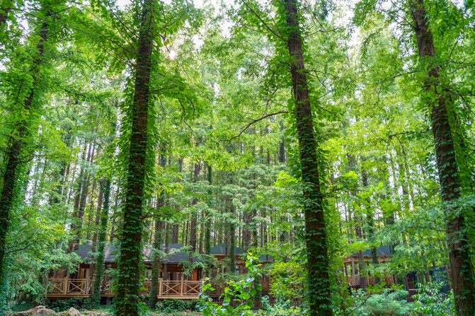 走近云顶野奢美宿,映入眼帘的是几栋错落有致的黄色小屋,加以大面积的灰蓝色点缀,增添了几分气质,久违的平和和安静油然而生,我想这大概便是旅行的意义。民宿背靠河山,前面是绿油油的草地,四周绿植环绕,苍翠欲滴,有种“隐居山林”的惬意,让人倍感岁月静好。