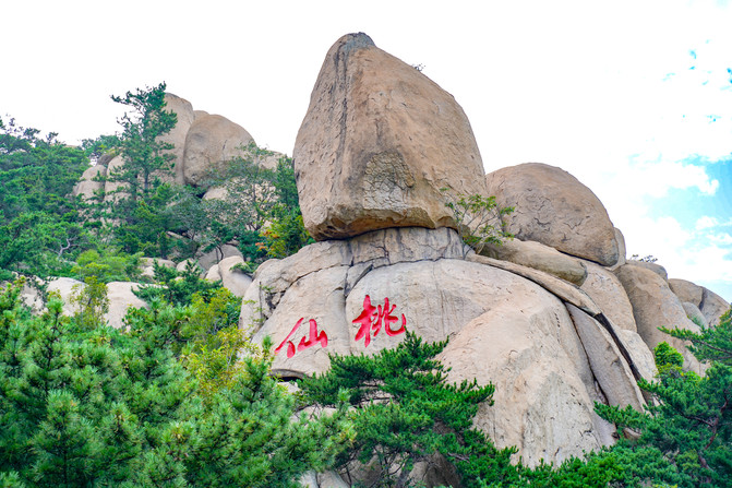 沿着缆车缓缓而上,宛若腾云驾雾,两侧树木苍翠,脚下是一望无际的绿色,有种莫名的神圣感。在上升的过程中,一座巨大的“仙桃”石刻映入眼帘,斑驳的石面上刻着“仙桃”二字,书法遒劲有力,红色的字迹与泛黄的底色相互映衬,历史厚重感扑面而来。石刻两侧青松屹立,尽显生命力量。