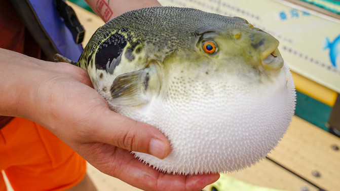 当成功钓到河豚的瞬间,我的开心无法言喻,可怜的小家伙不甘被抓,逐渐原形毕露,将自己吸成一个圆鼓鼓的大胖子,虽说早就听闻河豚有此“特异功能”,但当自己亲眼目睹时,依旧充满了闻所未闻的激动。很难想象,小小的身子竟然能胖成五倍大,可见大自然的奇妙。可惜这小家伙表达不满的方式过于可爱,让人频频不肯松手,恨不得将其抱回家。