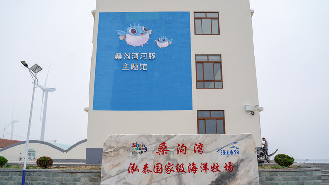 初见桑沟湾海洋牧场,便被其热情朴实的渔民气息所吸引,蓝天白云下,一块大理石石碑静静矗立着,纹路深浅不一,“桑沟湾泓泰国家级海洋牧场”等字映入眼帘,红色的字迹格外鲜艳,招牌的两侧绘有闲趣的图案,增添了几分鲜艳的元素,让人眼前一亮。