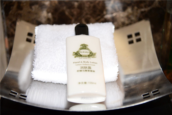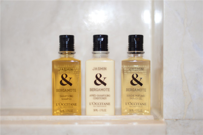 房间里还提供有免费的水果和饮料,崂山可乐头一回喝,有一股淡淡的中药味道。茉莉花茶和红茶是斯里兰卡进口的滋达,咖啡则是荷兰的品牌,洗浴品用的是欧舒丹,卫浴是日本的Toto,马桶盖也是日本的,卫洗丽品牌。