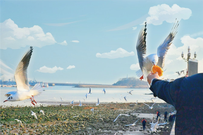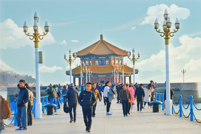 栈桥,青岛的地标性建筑,靠近火车站,距离中山路10分钟脚程。建于1892年,清代所以回澜阁的建筑风格还是古建筑的样式。栈桥像栈道一样延伸到海里,尽头是回澜阁。两边有沙滩跟海石,还有第一海水浴场。冬日来青岛有一种夏天看不到的景象,成千上万只海鸥从西伯利亚飞到青岛过冬,它们或翱翔天际,或栖息海面,或奋起争食。在栈桥上,可以一边欣赏海景,一边喂海鸥。朝霞与海鸥齐飞,礁石海风海浪,人与自然和蔼相处的美好画面。
