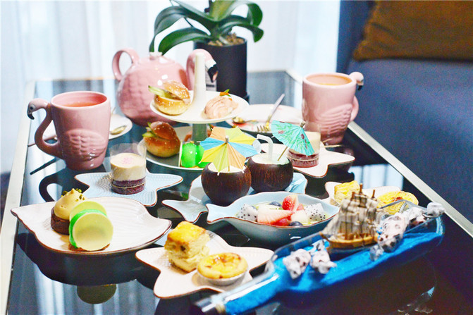 威斯汀酒店位于青岛香港中路,出了酒店就是地铁口,距离五四广场步行不到10分钟,交通便利,是市区入住率非常高的酒店,在转角位置的行政套房视野不错。如果想远眺青岛市景,不妨到顶楼的行酒廊,白天有简单的曲奇饼干和饮料提供。新推出的海洋双人下午茶仅售118元,无论从环境、摆设、或是餐具,全部依照传统英式下午茶习惯打造。绝美的瓷壶、精致的碟子……每一款都只能在电影中出现的画面,居然如此实在地摆在面前。由司康、蛋糕,蛋挞,寿司、三明治、牛轧糖和水果组成的套餐,每一个细节都让人惊叹!