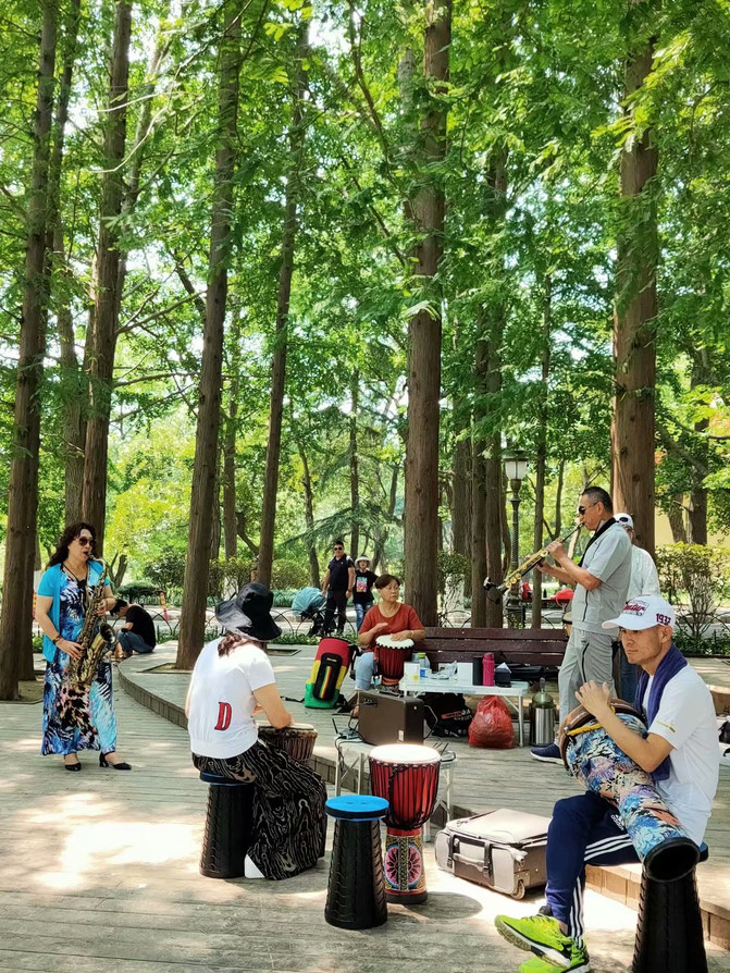 青岛的文艺和浪漫随处可见,经过一片繁茂挺拔的水杉林,偶遇一群音乐艺术家现场表演。