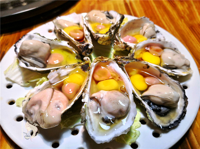 九阳神功:8只生蚝里都加入新鲜鹌鹑蛋和鸡肾,然后放在蒸格上高火蒸(蒸锅下面是同时现煮的皮蛋瘦肉粥或者虾仁海鲜粥),然后沾上根据自己口感调的秘制调料,鲜嫩爽滑不要太好吃哇。