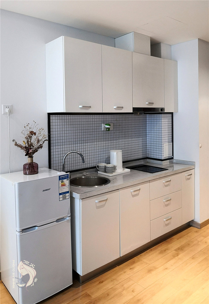开放式厨房配备微波炉、电磁炉、抽油烟机、基本的厨具、小冰箱和洗衣机,生活更随心。