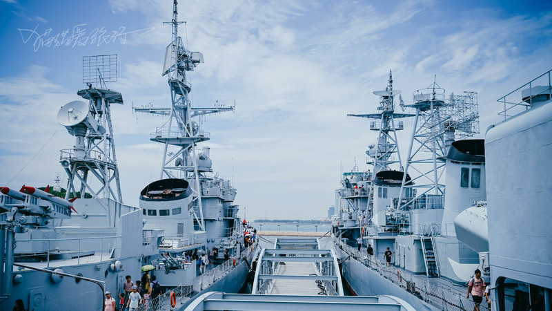 站在岸边,老远就可以海军博物馆的镇馆之宝,中国自研的第一艘驱逐舰105济南舰、首艘091攻击型核潜艇长征一号。