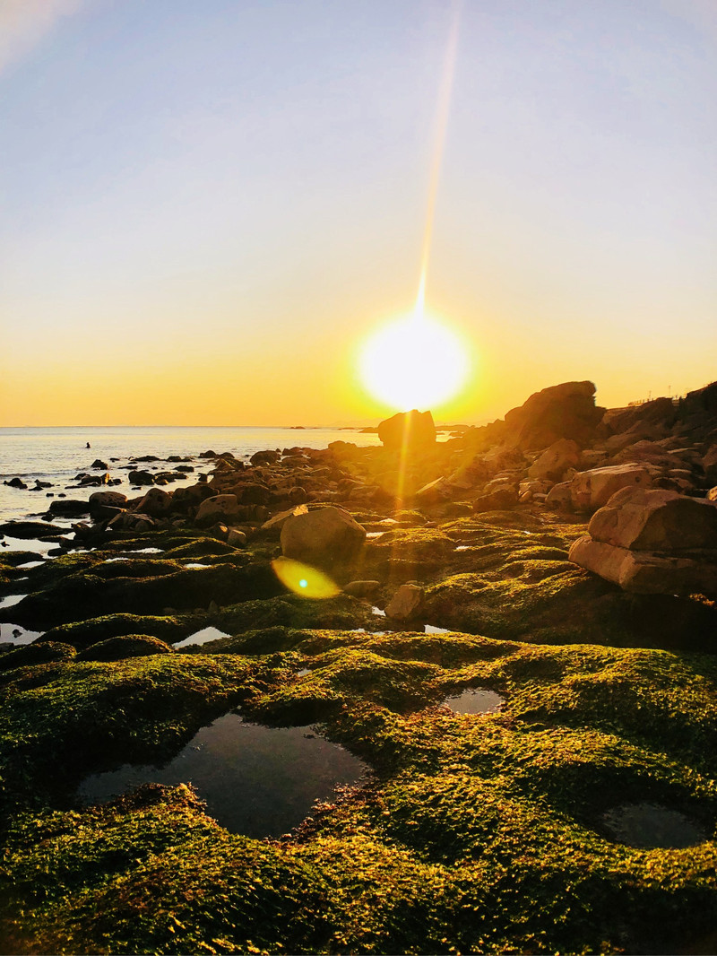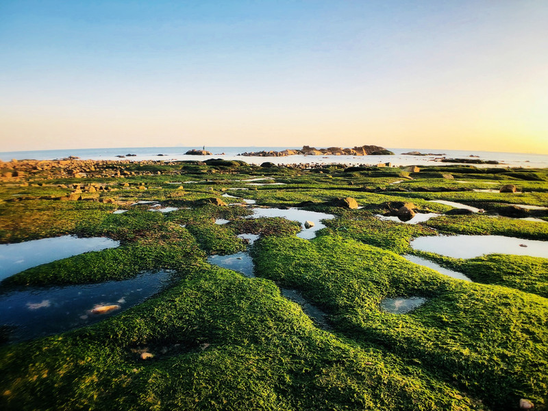 途径燕儿岛公园(开放式,无门票),公园与海滨步道无缝连接,沿着台阶来到距离海更近的地方,深一脚浅一脚走过海边的乱石滩,眼前绿茸茸一片——海藻滩,衬着夕阳,这景象不同于曾见过的任何海景,好像草地一直延伸着到了海里,真是可爱。