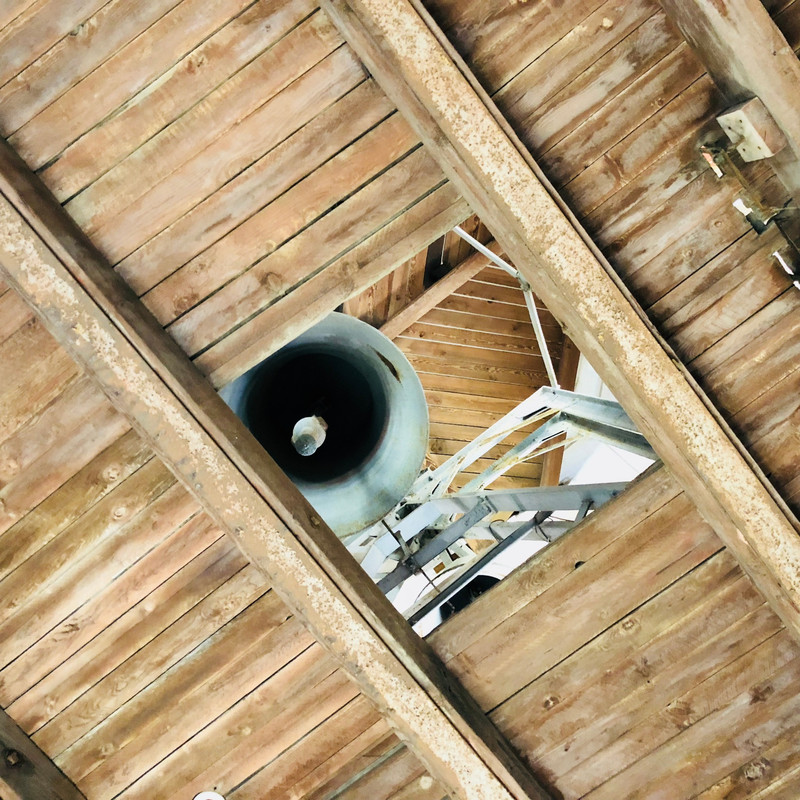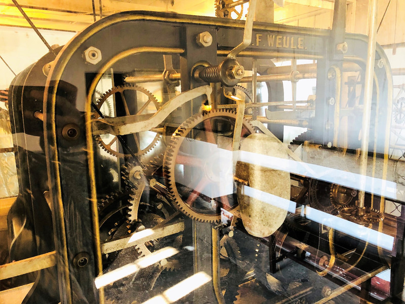 顺着楼梯往上可以来到钟楼内部,内有大、中、小三口钟,机芯都是1909年在德国设计并制造之后运至青岛,兼有礼拜敲钟和报时两个功能,时至今日,依然走时精准,每逢半点和整点,钟声悠扬。