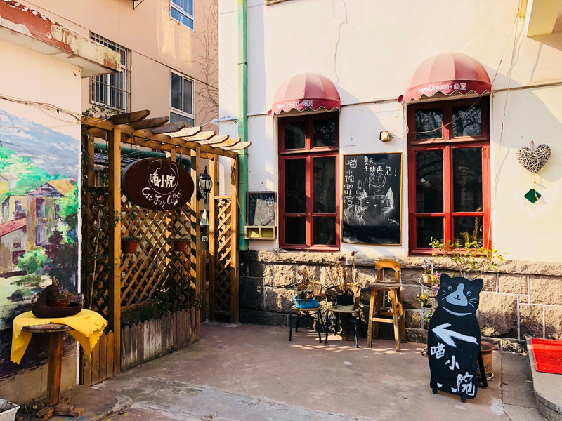 看着这红墙琉璃瓦,真的会错觉怎么海边也有个皇城根儿,同样的色调、同样的feel、同样大排长龙的拍照小姐姐,秉持着见排队就撤的原则,避开了男神女神们汇集的大学路与鱼山路交叉口,继续沿着大学路向里走,本就有些低糖,途径数个咖啡馆却都没能说服自己迈步进去,直到遇见这家——有20多只喵星人的猫咖喵小院。