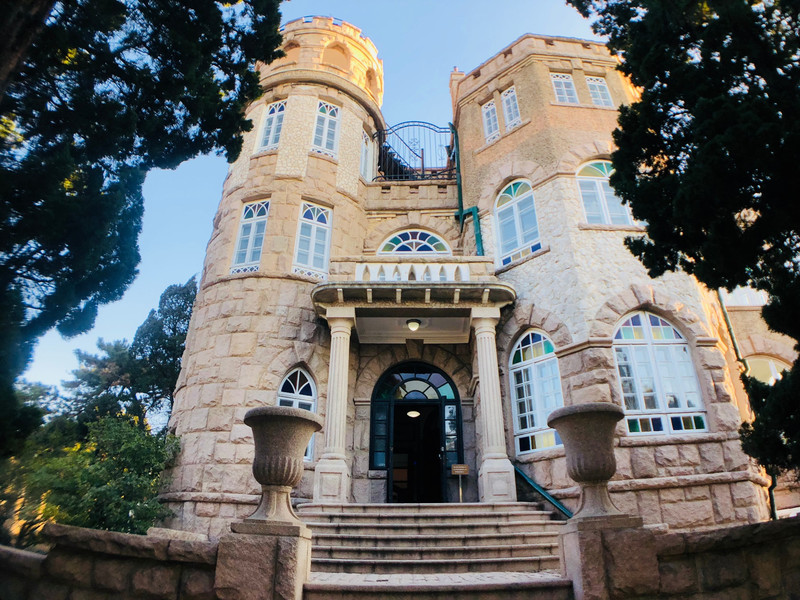花石楼给人最深的记忆点应该就是相传解放前蒋介石曾居于此,这是一座由一位白俄设计师建造、融合了西方多国风格的建筑,整体没有任何雕塑装饰,只采用了朴实无华的花岗岩贴满整个外墙,唯一的点缀就是琉璃的彩玻璃与爬墙虎。