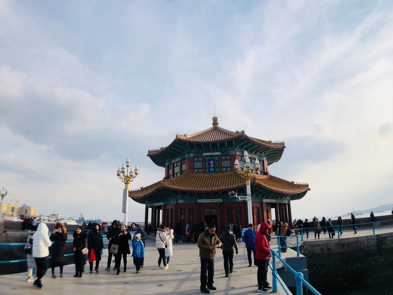 栈桥前段有一八角形状小楼,其内陈列着栈桥的前世今生及相关物件儿,无需门票,但人多时会排队限流,可歇脚避寒,自然还可在此处观海潮浮云。怎么?没有网上的图片好看,据本人不充分调查,青岛栈桥网络图片80%以上为航拍,所谓上帝视角下何处无风景,现实就是如此。