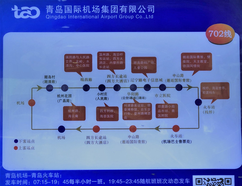 从西安到青岛,2h的飞行转眼就过去了,即便晚点了一点,也很余裕。青岛的机场大巴四通八达,选择702线路刚好能到酒店附近的四方汽车站。(详见下图)
