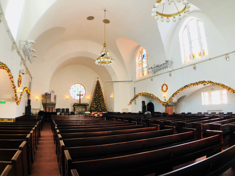 宽敞明亮的礼堂,平日能容纳1000多人,原先是专供德国信徒聚会的礼拜堂,1949年后,成为了中国基督教徒的主要活动场所。