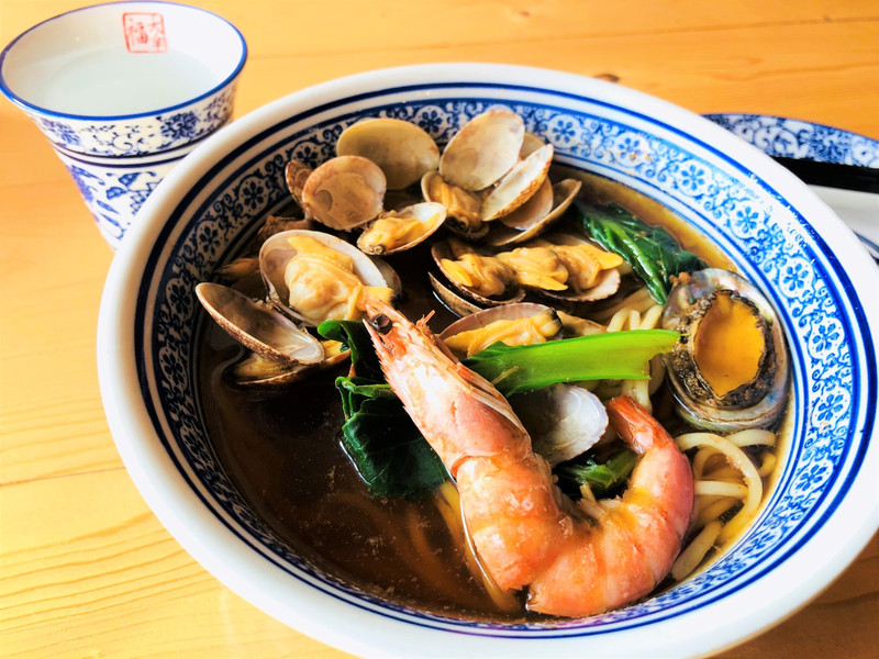 往栈桥去的路上遇到一家饺子馆,来一碗海鲜面作为午饭,看卖相倒是真材实料,不过一直奇怪,青岛的海鲜怎么还蛮贵的,普通一碗海鲜面要价50元。