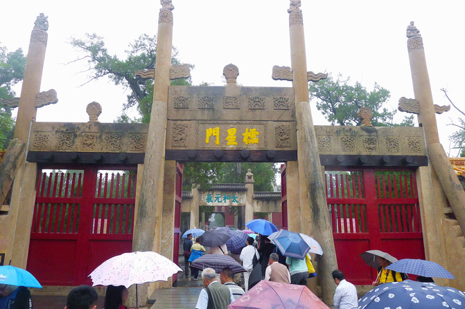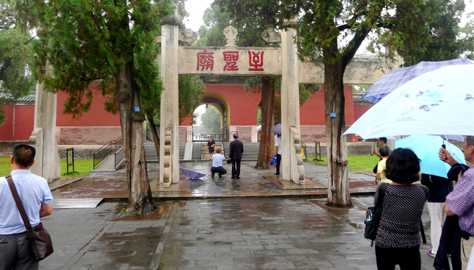 8:20坐上公交车,不一会就抵达“万仞宫墙”城门,它是明代曲阜城墙的正南门,团队全体在门前合影。导游介绍说,孔庙外围原本并无城墙,明朝农民起义将早期的孔庙焚毁,明朝皇帝重修孔庙并特意专筑曲阜城墙加以护卫,眼前的城门便是明朝曲阜城之正南门,旧称“仰圣门”,后来,清朝的乾隆皇帝御笔题写石额,将其改称“万仞宫墙”。这座城门是专为孔庙而设,因而,进入此门后立马便是孔庙的大门。