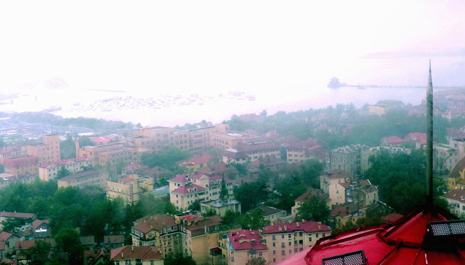 导游宣布自由活动,大家三、五结伴走上栈桥,现时的栈桥为钢混结构,宽8米,长440米。我站在栈桥南端的“回澜阁”旁眺望,前方海中有座小岛称“小青岛”,其对面是“海军博物馆”,停泊多艘已退役的军舰。栈桥西侧隔海相望是青岛市的另一处地标性建筑“海上皇宫”,它造型别致,好似由一个扣在海水中的白色壳状半球和一个竖起的壳状半球组合而成。“海上皇宫”对面是漂亮的海关大楼,再加上其他高楼组合,让我感觉有点儿像是上海“陆家嘴”的韵味。然而,青岛本地人却有另外的说法,传言风水大师认为“海上皇宫”与“海关大楼”的组合好似坟墩与墓碑,非常不吉,因而,五星级的“海上皇宫”开业不久即因“经营不善”而关门,其对面的海关大楼内也曾多次发生不吉利事件。当然,这些纯属无稽之谈。