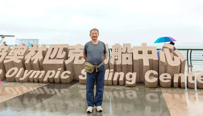 9:25抵达海边,首先是看到“青岛奥林匹克帆船中心”的标志,然后冒雨走向“五四广场”。雨下得很大,我们并没有真正走到广场,只是站在远处用青岛市的著名地标“五月的风”为背景,拉开“四十二载齐鲁再聚首,催化学子遥寄厦大情”条幅,拍摄了几张照片。“五月的风”是一座高大的血红色雕塑,耸立在“五四广场”最南端,其造型为螺旋上升的风,寓意“五四运动”所刮起的反帝、反封建民族风暴。