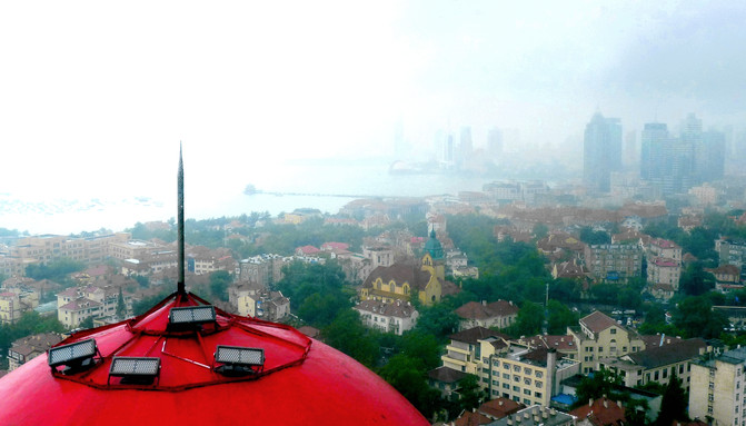 “信号山公园”是青岛老城的制高点,进入公园免费,但旋转观景楼须购票,我们是导游统一购票登楼。这座旋转观景楼也是“信号山”公园内的最大看点,高约20米,顶层大厅的地面可以旋转,设有观景座椅,游人坐着不动就可以全方位地眺望青岛全貌:栈桥、小青岛、大海以及远近的红瓦绿树、山光水色全都一览无余。