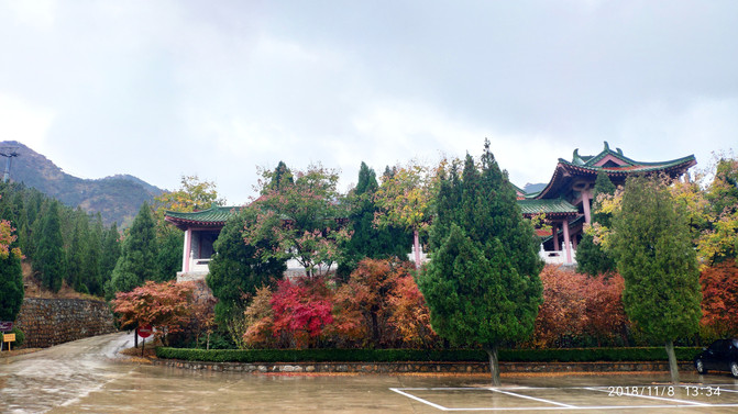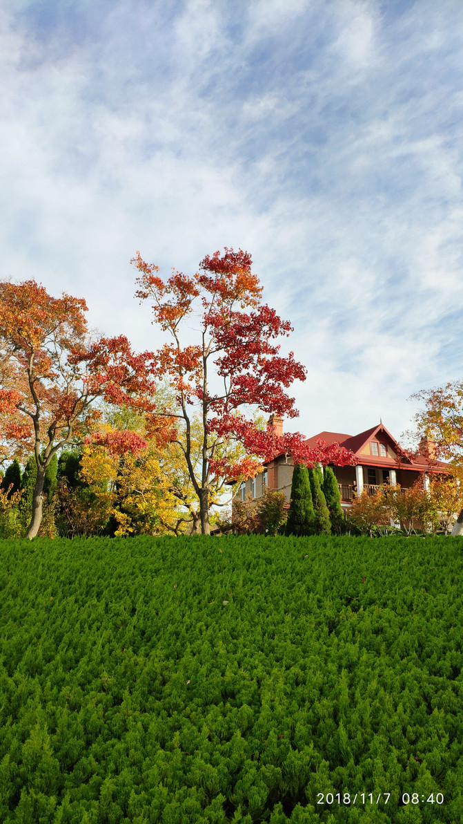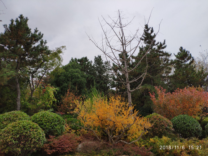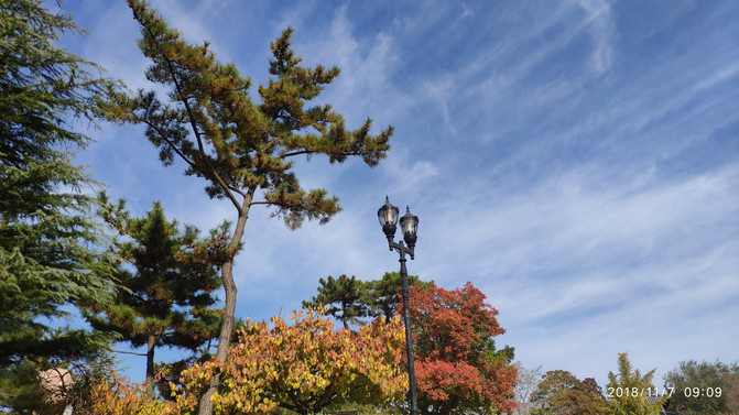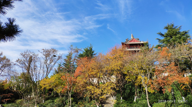 入住后14点多,刘公岛最后一班船17点返航,实在太赶;看环翠楼就在边上,天气有点阴凉但还算好,就决定去随便逛逛顺便找个地方晚餐。步行不到10分钟就到了景区南门(or东门?),景区挺大,这个季节北方的树木叶绿素加速分解,从绿到黄到红,各种颜色层叠交错、满目缤纷,甚是好看,南方是比较少见的。入环翠楼需要身份证本人认证领免费门票,还要穿鞋套,从外部看是很有气势,但内部全是没有太大相干的艺术品展览,门还全封闭了不能出到楼外观景,挺可惜的。