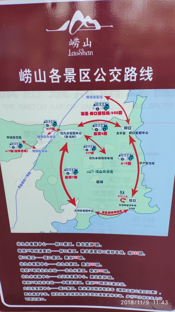首先要大家放心的一点是虽然游览车没有直接联通,但是中间是有公交618路接驳的,而且即使在目前的淡季,据观察和司机沟通,至多10分钟就有一班,旺季就更频繁了,因此大家完全不用担心接驳问题。游玩这条线路,可以从大河东游客中心入口出发,也可以从仰口游客中心入口出发,看个人交通方便了,两边都有公交直达,如果从青岛市区过去,当然仰口要更远,至少多半个小时。