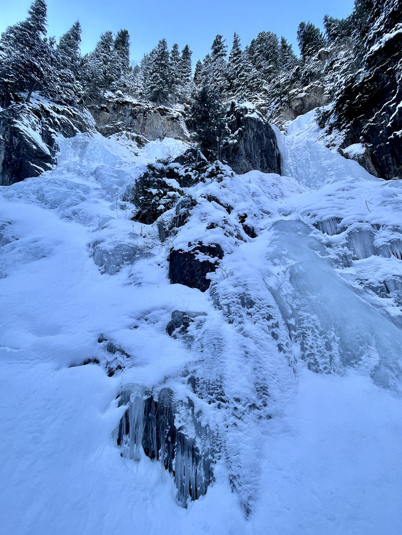 我还是第一次在雪地里骑马,半个小时不到,就来到了冰瀑布。整个瀑布不大,但是因为全部冰封,还是很壮观。仔细聆听,还有水流的声音,原来瀑布下面其实正暗流涌动。