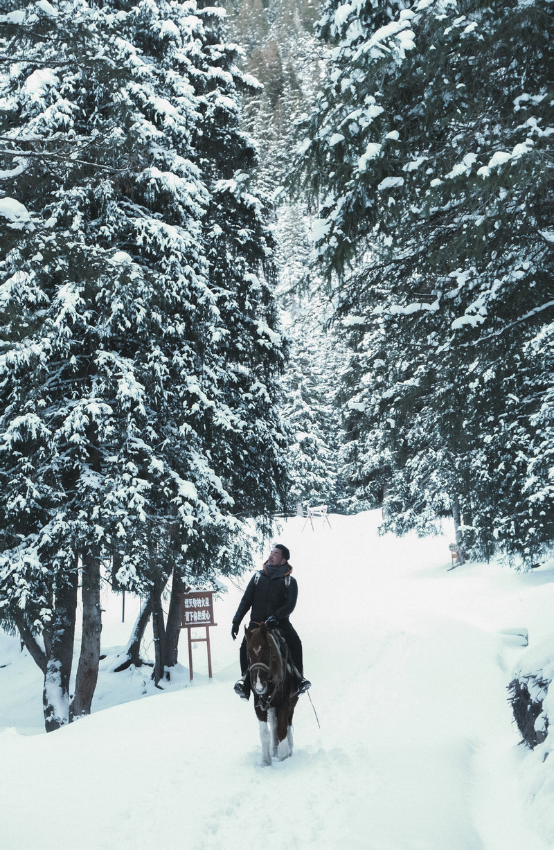 在下雪的山上徒步确实很累,除了要保证体力充沛,身体也一定要注意保暖,不要失温,因为越往深处走,没有太阳的树林里就真的非常冷。如果觉得自己走不上去,也可以骑马。