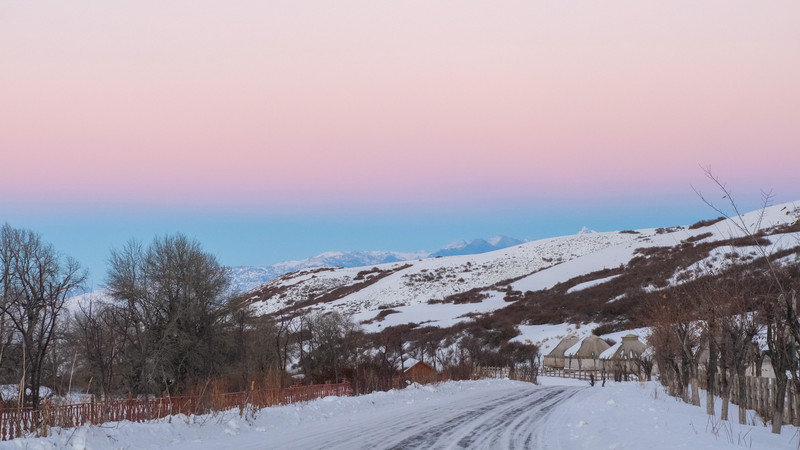 爬上山顶平台,虽然咸蛋黄已经躲在山后面不知踪影,但是橙粉色的天空,绵延不绝的山脉和大地上的皑皑积雪,都让我觉得自己还是很幸运,拥有了此刻专属于我的浪漫。