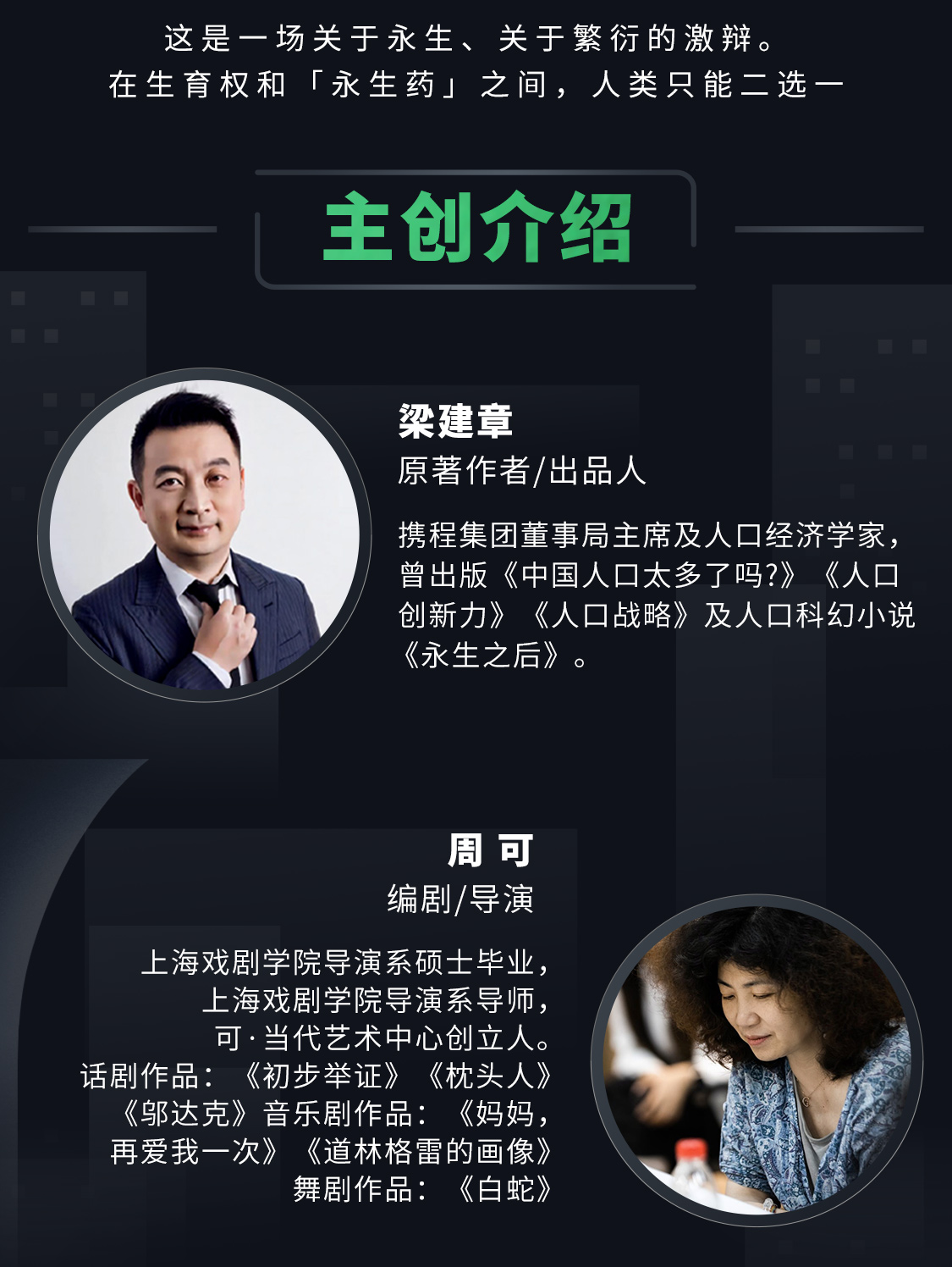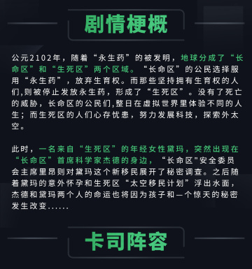公元2102年,随着“永生药”的被发明,地球分成了“长命区”和“生死区”两个区域。“长命区”的公民选择服用“永生药”,放弃对后代的繁衍。而那些坚持拥有生育权的人们,则被停止发放永生药,形成了“生死区”。没有了死亡的威胁,长命区的公民们,整日在虚拟世界里体验不同的人生;而生死区的人们心存忧患,积极创新,努力发展科技,探索外太空。