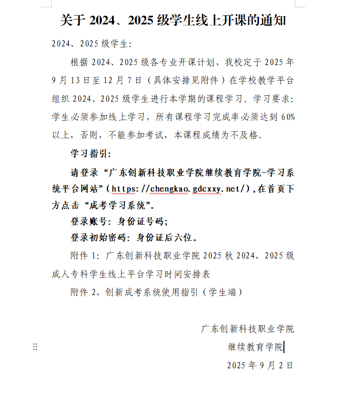 | 关于2024、2025级学生线上开课的通知 更新时间:2025/9/12 11:32:00 |